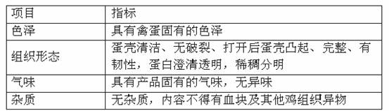 為貫徹預防為主的方針和執(zhí)行《中華人民共和國食品衛(wèi)生法》,加強對蛋與蛋制品的衛(wèi)生管理,提高蛋品質(zhì)量,保障人民身體健康,國家制定了蛋品衛(wèi)生標準。按照衛(wèi)生部提出的、原技術監(jiān)督局《鮮蛋衛(wèi)生標準》(GB2748—2003),鮮蛋的感官指標和理化指標應達到下列要求。