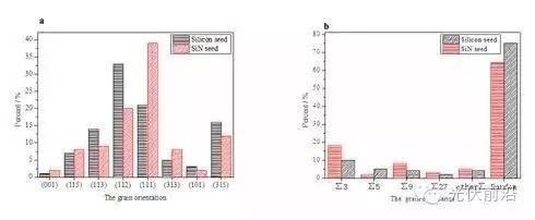 (2)有籽晶高效多晶硅技術(shù)生長(zhǎng)硅錠底部晶粒晶向分布{112}晶向占主導(dǎo),隨機(jī)晶界比例相對(duì)較高,硅錠底部晶體品質(zhì)優(yōu)勢(shì)較大。