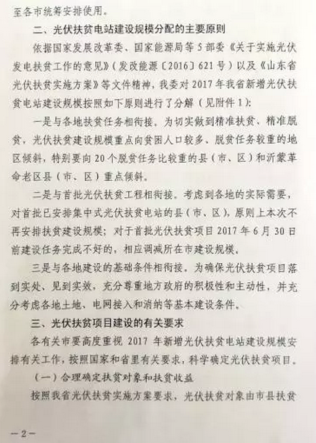 山東省2017年500MW光伏電站指標(biāo)分配方案
