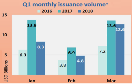 從規(guī)模來看,比利時,法國和中國領(lǐng)跑全球綠色債券市場。來自新興市場的發(fā)行量正在增加,占季度發(fā)行量的32%,而2017年第一季度僅為15%。