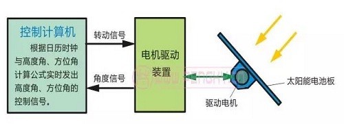 主動(dòng)式跟蹤控制根據(jù)控制計(jì)算機(jī)預(yù)先存儲(chǔ)的當(dāng)?shù)亟?jīng)緯度等數(shù)據(jù)與太陽(yáng)運(yùn)動(dòng)的軌跡函數(shù),再根據(jù)實(shí)時(shí)時(shí)鐘的精確時(shí)間信號(hào),按地平坐標(biāo)系相關(guān)函數(shù)計(jì)算出實(shí)時(shí)的太陽(yáng)高度角與方位角,發(fā)出控制信號(hào)。電池板的軸系驅(qū)動(dòng)部件根據(jù)這些信號(hào)把電池板轉(zhuǎn)向指定的高度角與方位角,從而對(duì)準(zhǔn)太陽(yáng)。在整個(gè)控制過(guò)程中無(wú)需檢測(cè)電池板是否對(duì)準(zhǔn)了太陽(yáng),直接發(fā)控制命令,所以是主動(dòng)式控制。由于控制過(guò)程不檢測(cè)太陽(yáng)位置,不是根據(jù)檢測(cè)到的太陽(yáng)位置偏差進(jìn)行控制的,在自動(dòng)控制技術(shù)中稱(chēng)為開(kāi)環(huán)控制。