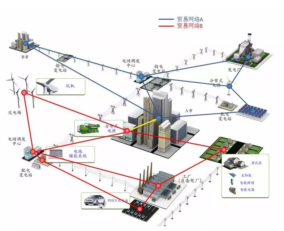 節(jié)點電價所采用的物理潮流模型屬于圖2中第1層(電力系統(tǒng)層)的網(wǎng)絡模型,但電能商品的交易(貿易)關系包括比物理電網(wǎng)更多的社會和經(jīng)濟屬性,為體現(xiàn)這種復雜的交易(貿易)關系,本文引入“貿易網(wǎng)絡”的概念,一個相關的概念是運營管理(Operations Management)課程中所講的“供應鏈網(wǎng)絡”(Supply chain network,https://en.wikipedia.org/wiki/Supply_chain_network)。供應鏈網(wǎng)絡是基本供應鏈(supply chain)的發(fā)展。由于技術的快速進步,具有基本供應鏈的商業(yè)組織可以將這個鏈發(fā)展成更復雜的結構,涉及更多商業(yè)組織之間的更高層面的相互依賴性和連接性,因而形成供應鏈網(wǎng)絡。在電力市場中,貿易網(wǎng)絡或供應鏈網(wǎng)絡是一種由發(fā)、用電權交易而組成的抽象的網(wǎng)絡,與物理電網(wǎng)是兩回事。電能商品貿易網(wǎng)絡與物理電網(wǎng)的關系可用圖3來表示。圖3中,在同一個物理電網(wǎng)的基礎上,形成了2個貿易網(wǎng)絡,藍色的貿易網(wǎng)絡A由主力化石能源發(fā)電廠、A市的主要商業(yè)負荷、B市負荷和少量可再生能源的電能交易而形成,采用統(tǒng)一電能價格(不含輸配電價)。而紅色的貿易網(wǎng)絡B由工廠及其自備電廠、風電場、居民用戶及屋頂太陽能、A市分布式電源及次要商業(yè)負荷、電池儲能系統(tǒng)及PHEV充電站的電能交易形成,采用統(tǒng)一電能價格(不含輸配電價)。2個貿易網(wǎng)絡在A市相連。顯然2個貿易網(wǎng)絡與物理電網(wǎng)的拓撲結構不同,也不服從物理潮流定律,實際上,貿易網(wǎng)絡屬于圖2中第2層(商品交易層)的網(wǎng)絡模型。
