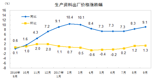 從同比看,PPI繼續(xù)上漲,漲幅比上月擴大0.6個百分點;從環(huán)比看,PPI漲幅比上月擴大0.1個百分點。漲幅擴大的主要原因來自于國內(nèi)供給側(cè)結(jié)構(gòu)性改革持續(xù)推進(jìn)。從PPI的內(nèi)部結(jié)構(gòu)來看,PPI上漲實際上是結(jié)構(gòu)性的上漲。生活資料方面增速相對比較平穩(wěn),而生產(chǎn)資料價格漲幅自7月份開始呈擴大趨勢,9月份同比上漲9.1%,是推動PPI漲幅擴大的主要原因。