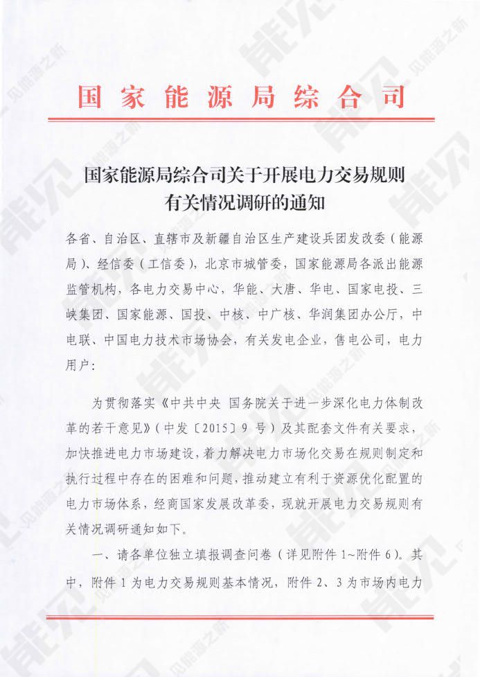 8月16日,國家能源局綜合司印發(fā)《國家能源局綜合司關(guān)于開展電力交易規(guī)則有關(guān)情況調(diào)研的通知》,通知指出為加快推進(jìn)電力市場建設(shè),著力解決電力市場化交易在規(guī)則制定和執(zhí)行過程中存在的困難和問題,推動(dòng)建立有利于資源優(yōu)化配置的電力市場體系,經(jīng)商國家發(fā)展改革委,現(xiàn)就開展電力交易規(guī)則有關(guān)情況調(diào)研,包括: