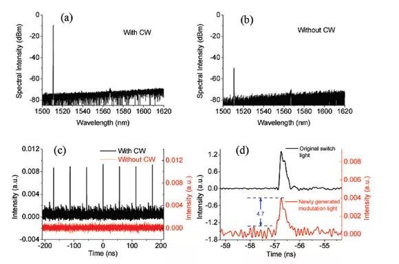 圖3 全光調(diào)制實(shí)驗(yàn)結(jié)果:(a)打開(kāi)信號(hào)光情況下的輸出光譜;(b)關(guān)閉信號(hào)光情況下的輸出光譜;(c)打開(kāi)或關(guān)閉信號(hào)光情況下的輸出光脈沖波形;(d)原始開(kāi)關(guān)光與新產(chǎn)生的調(diào)制光脈沖波形對(duì)比。