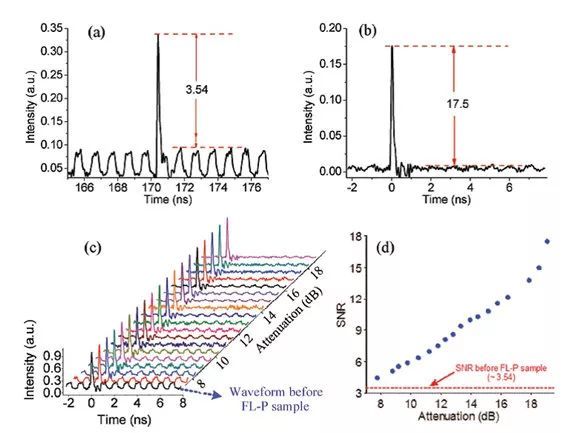 該團(tuán)隊(duì)采用電化學(xué)陰極剝離方法聯(lián)合離心技術(shù)成功制備出了大面積少層(主要是4層)黑磷。然后,將少層黑磷材料光沉積在微納光纖的拉錐區(qū)上,制備出黑磷-微納光纖復(fù)合結(jié)構(gòu),其中微納光纖作為光波導(dǎo),實(shí)現(xiàn)光在微納光纖中的穩(wěn)定傳輸。利用微納光纖表面的倏逝場(chǎng)和少層黑磷材料的相互作用,在高功率激光抽運(yùn)下,黑磷的載流子會(huì)發(fā)生帶間躍遷。在載流子的弛豫時(shí)間內(nèi),體系對(duì)其他透過(guò)的光不再吸收,由此即實(shí)現(xiàn)了黑磷的飽和吸收特性。基于此,該團(tuán)隊(duì)首次實(shí)現(xiàn)了能夠抑制噪聲、增強(qiáng)光脈沖信噪比的全光閾值器件。實(shí)驗(yàn)結(jié)果表明信噪比從3.54提升至17.5,如圖2所示。