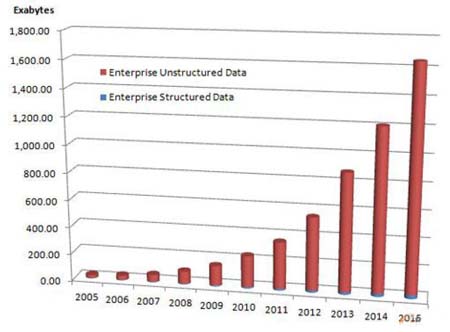 根據(jù)國際數(shù)據(jù)公司(IDC)的測算,2011 年數(shù)字世界將產(chǎn)生1800EB 的數(shù)據(jù),2012 年會增長40%,達到2500EB。截止2020 年,會達到35000EB,似乎沒有足夠的磁盤空間存儲。就傳統(tǒng)IT 企業(yè)來看,其結(jié)構(gòu)化和非結(jié)構(gòu)化的數(shù)據(jù)增長也是驚人的。2005 年企業(yè)存儲的結(jié)構(gòu)化數(shù)據(jù)為4EB,到2015 年將增至29EB,年復(fù)合增長率逾20%。非結(jié)構(gòu)化數(shù)據(jù)發(fā)展更猛。2005 年為22EB,2015 年將增至1600EB,年復(fù)合增長率約60%,遠遠快于摩爾定律。