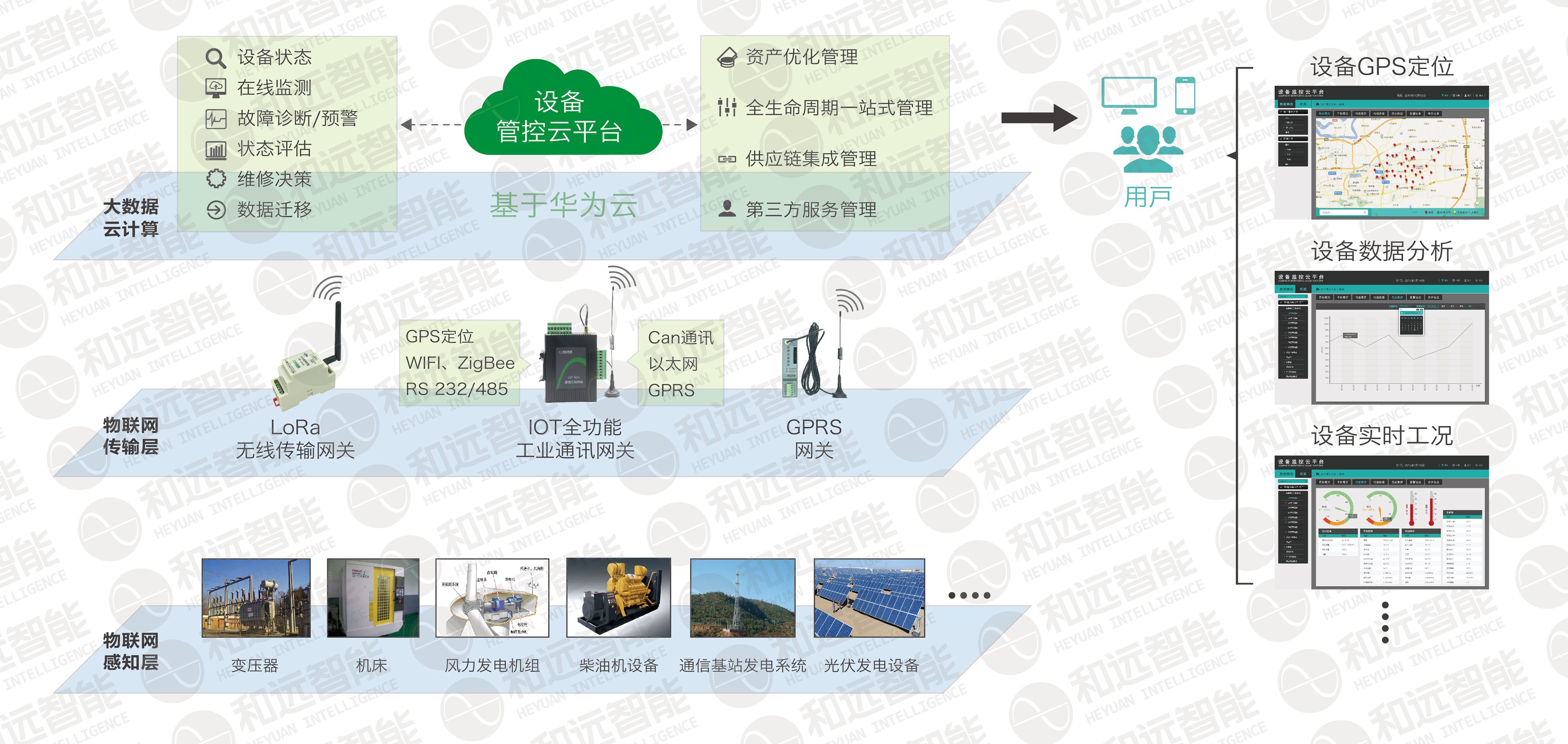 設(shè)備監(jiān)控系統(tǒng)針對(duì)設(shè)備監(jiān)控與管理存在的諸多問(wèn)題,采用先進(jìn)的傳感器與智能傳感終端,運(yùn)用物聯(lián)網(wǎng)技術(shù)對(duì)設(shè)備進(jìn)行全面的感知監(jiān)控。和遠(yuǎn)智能設(shè)備監(jiān)控系統(tǒng)采用四層架構(gòu),從物聯(lián)網(wǎng)感知層到傳輸層到分析層再到用戶SaaS應(yīng)用層,從設(shè)備數(shù)據(jù)全時(shí)段監(jiān)測(cè)到云平臺(tái)大數(shù)據(jù)分析處理,給客戶打造適合企業(yè)運(yùn)行狀態(tài)的定制化設(shè)備監(jiān)控系統(tǒng)解決方案。