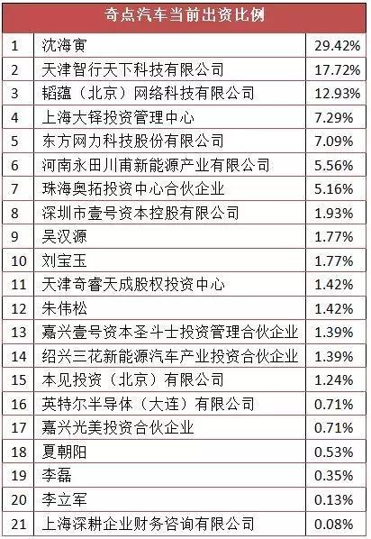 奇點(diǎn)汽車的主要股東方面,首先沈海寅和天津智行(沈海寅100%控股)分別持有29.42%和17.72%的股份。