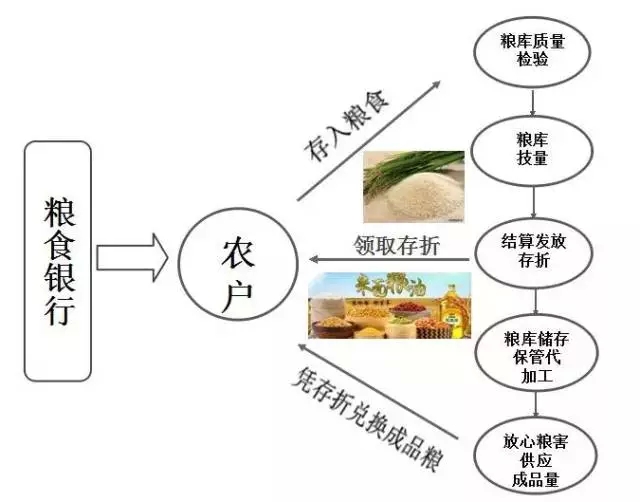 農(nóng)民打下新糧,存入企業(yè)提供的糧倉,定期或活期自由選擇,并且享有利息,這個糧倉就作為“糧食銀行”為農(nóng)戶提供代存代儲代加工糧食等服務(wù),糧食銀行會給農(nóng)戶發(fā)放 “糧食存折”,記錄著存糧日期、數(shù)量、取兌日期和余額等信息。農(nóng)戶還可憑存折在鄉(xiāng)村各個網(wǎng)點兌換米、油或化肥、種子、農(nóng)藥等各種農(nóng)資。農(nóng)戶走進糧食銀行,就好像走進了商業(yè)銀行的儲蓄所,只不過存取的內(nèi)容從現(xiàn)金變成了糧食。